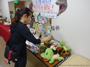 イベンターさんが、色んな種類の恐竜グッズとともに